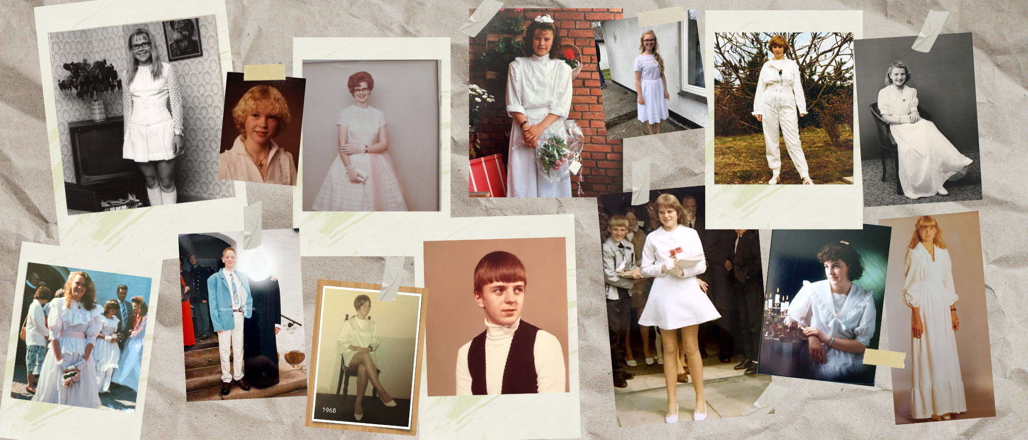 Der er både lårkorte, lånte, omsyede og nedarvede kjoler, posede og stramme, strikkede veste, farverige jakker og spraglede slips. Og hvert billede gemmer på en lille historie, der sladrer om tidens trend og strømninger. Endda er en konfirmationskjole gået i arv og brugt 57 år senere.